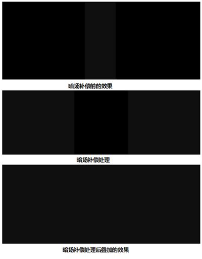 投影機的漏光,是指投影圖像為全黑色的時候,投影機仍舊有一部分光線能投射到投影幕上。這樣兩臺投影疊加以后,在純黑場的時候會出現一個中間亮帶。融合器需要用提升非疊加部分光強的方式,來抵消亮帶,這一個過程為暗場補償。